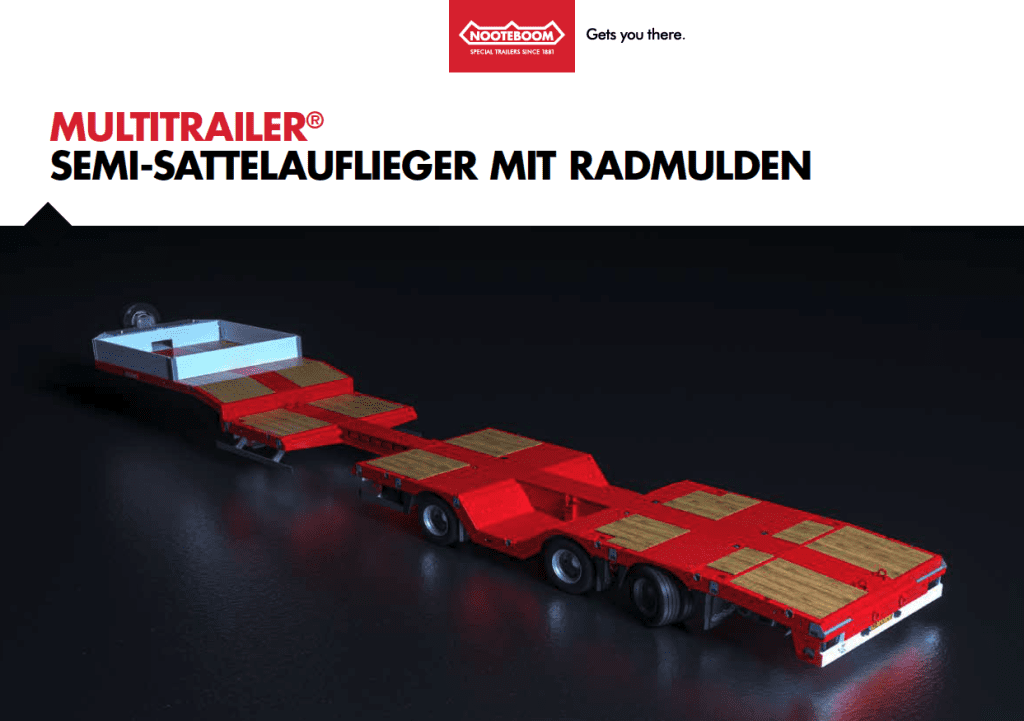 Die MULTITRAILER-Semi-Tieflader von Nooteboom sind multifunktional. Zu ihren Einsatzmöglichkeiten gehört der Transport von Baggern, Schaufeln, Straßenbaumaschinen, Wasserfahrzeugen, Zugangsplattformen, Kranteilen, Stahlstrukturen, Betonelementen und Windkraft – Komponenten wie Generator Gehäusen, Turmsektionen und Rotorblättern.